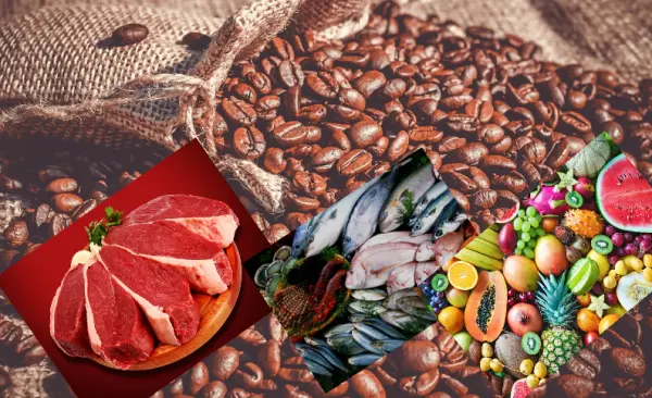 Carne, pescados, café e frutas
