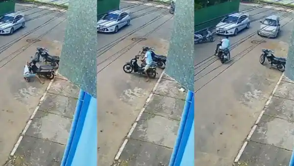 Imagens de uma câmera de segurança mostram o momento em que um homem se aproxima da motocicleta, força a partida e foge com o veículo. A ação durou menos de um minuto.