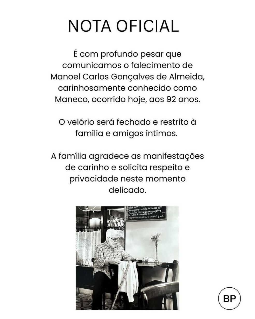 “É com profundo pesar que comunicamos o falecimento de Manoel Carlos Gonçalves de Almeida, carinhosamente conhecido como Maneco, ocorrido hoje, aos 92 anos. O velório será fechado e restrito à família e amigos íntimos. A família agradece as manifestações de carinho e solicita respeito e privacidade neste momento delicado”.