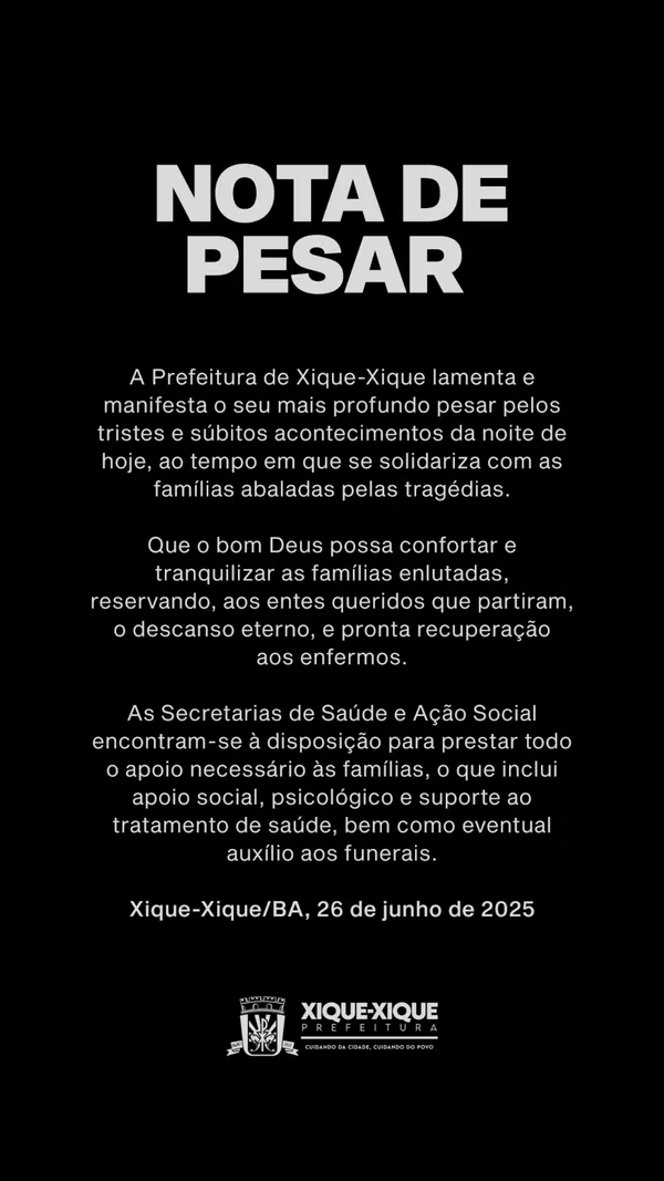 A Prefeitura de Xique-Xique emitiu uma nota de pesar, lamentando as mortes e prestando apoio aos familiares das vítimas: